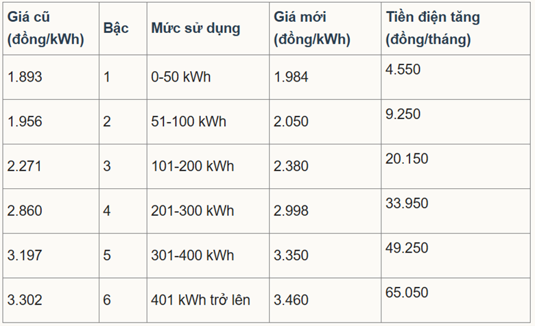 Biểu giá bán lẻ điện sinh hoạt từ ngày 10/5: